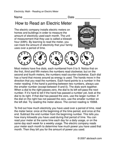 Grade 6 - Reading Electric Meter and Water Meter (FREE) Description. A free 2-page worksheet on reading electric and water meter. CHECK OUT THE OTHER WORKSHEET; Reading Electric and Water Meter (workbook type)